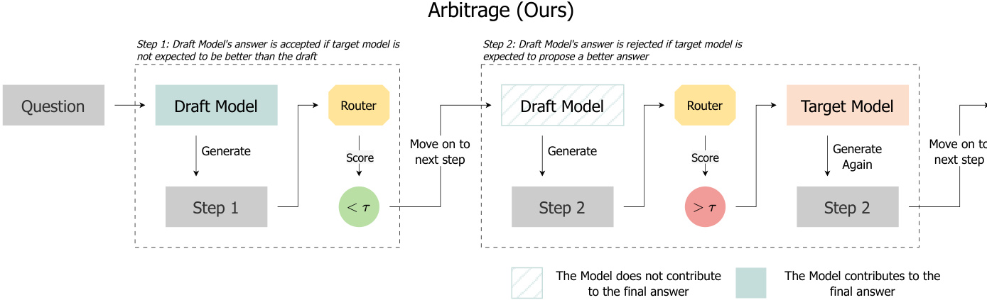 - ARBITRAGE introduces a dynamic routing mechanism that uses a lightweight router to predict when the target model is likely to produce a meaningfully better reasoning step, enabling more efficient use of target model compute.
