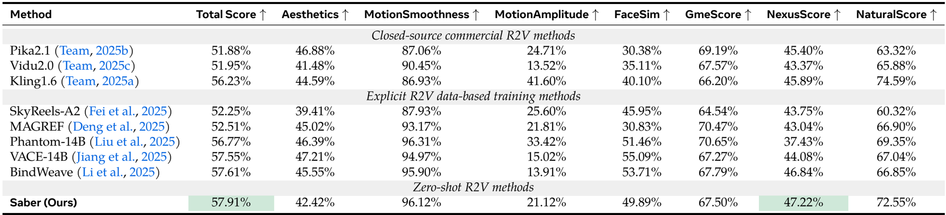 - Evaluated on OpenS2V-Eval benchmark, Saber achieves 57.91% total score in a zero-shot setting, surpassing closed-source methods like Kling1.6 (+1.68%) and explicitly trained R2V models including Phantom-14B (+1.14%), VACE-14B (+0.36%), and BindWeave (+0.30%).