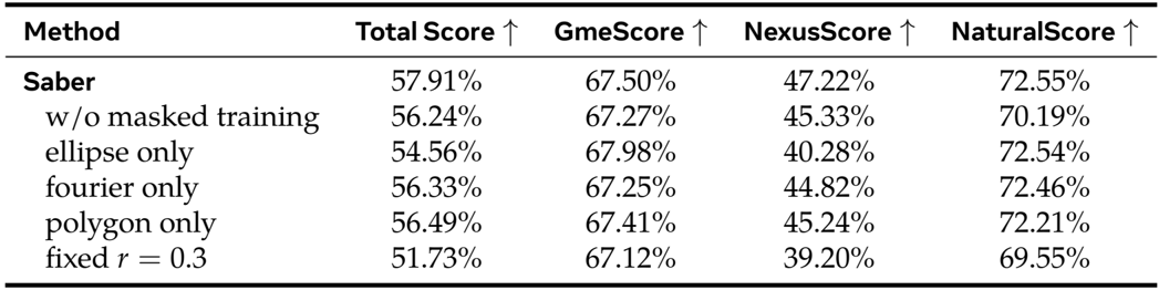 The authors evaluate Saber’s ablation components on the OpenS2V-Eval benchmark, showing that removing masked training reduces the total score by 1.67% and significantly lowers NexusScore, indicating weaker subject consistency. Using only one mask type or fixing the foreground ratio degrades performance, confirming that mask diversity and adaptive masking are critical for generalization and video quality.