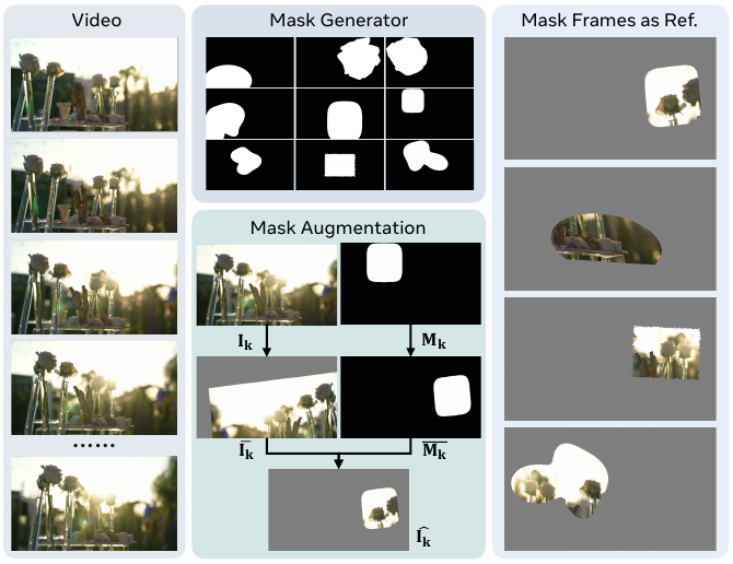 - A masked frame training approach that randomly samples and masks video frames as synthetic reference images, enabling data-efficient, scalable learning without curated R2V datasets