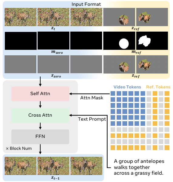 zin=catcat[ztcat[mzerocat[zzerozref]temporalmref]temporalzref]temporalchannelAs shown in the figure below, the transformer processes this input through a sequence of blocks, each comprising self-attention, cross-attention, and feed-forward modules. In self-attention, video and reference tokens interact under an attention mask derived from the resized masks Mk, ensuring that only valid reference regions are attended. Cross-attention then integrates text features zP, guiding video tokens with the text prompt while aligning reference tokens semantically. The time step t is injected into the latents to modulate the diffusion process. The output of the transformer is the predicted latent zt−1, which is decoded by the VAE to generate the next video frame.