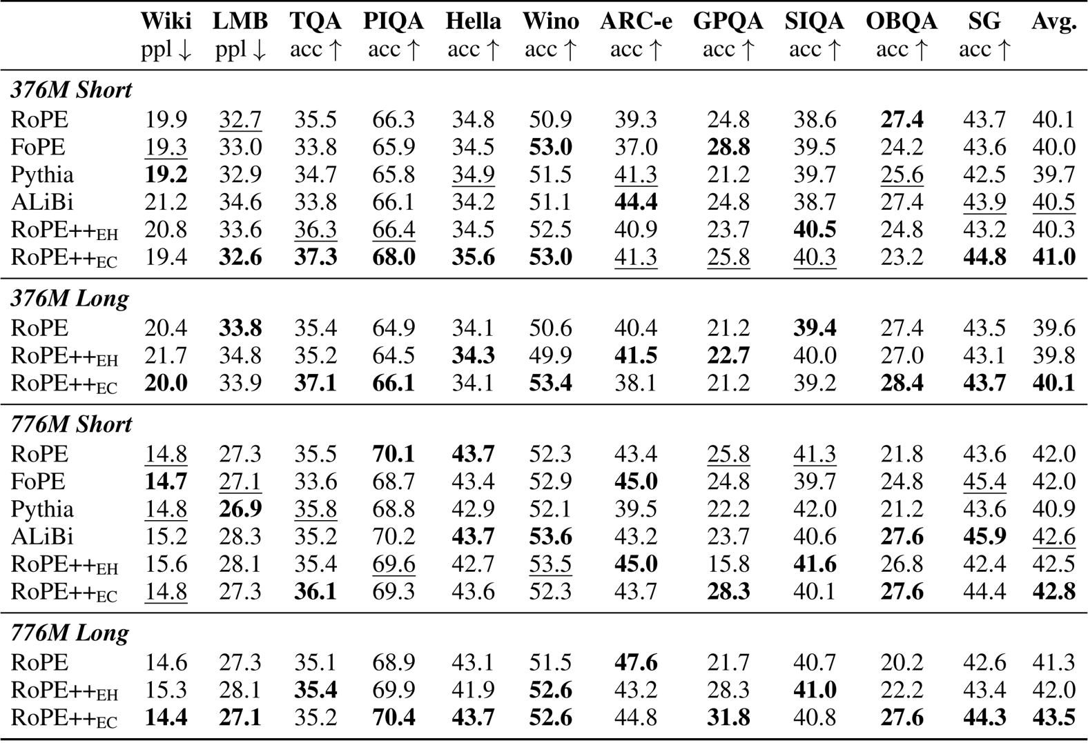 The authors use RoPE++ with two variants, EH and EC, to improve position encoding in transformer models and evaluate them against standard RoPE and other designs on short-context benchmarks. Results show that RoPE++EC consistently achieves the highest average scores across both 376M and 776M model sizes, outperforming all baselines including RoPE, FoPE, Pythia, and ALiBi. RoPE++EH also performs competitively, matching or exceeding RoPE despite using half the KV cache and QKV parameters.