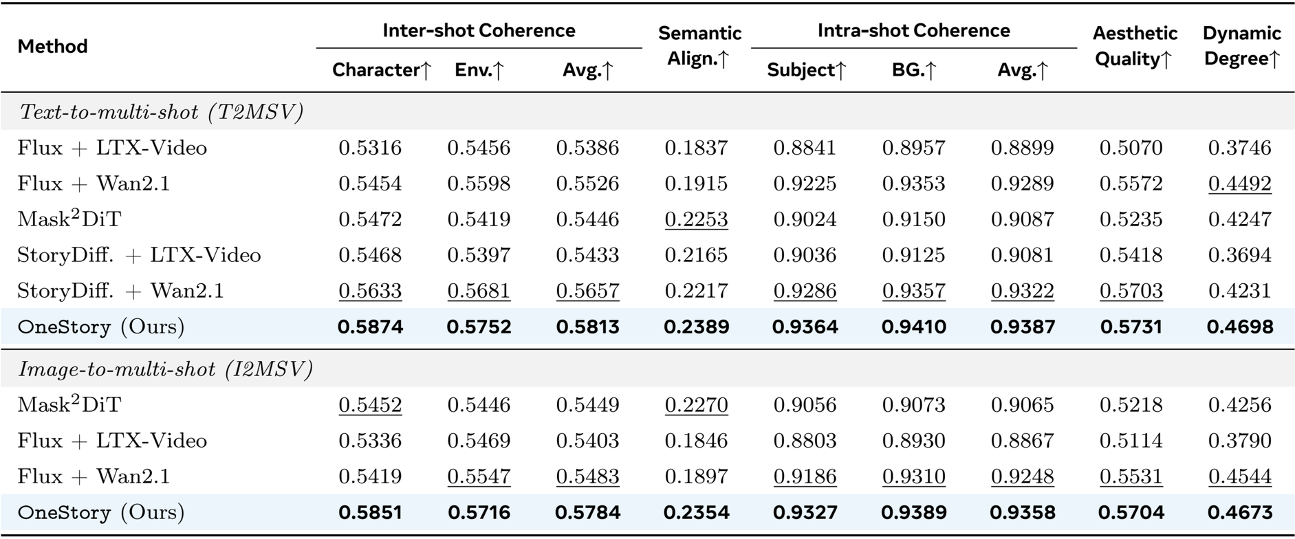 The authors use OneStory to generate multi-shot videos under both text- and image-conditioned settings, evaluating performance across inter-shot coherence, semantic alignment, intra-shot coherence, aesthetic quality, and dynamic degree. Results show OneStory consistently outperforms all baselines in both settings, achieving the highest scores across nearly all metrics, particularly in character and environment consistency, semantic alignment, and subject-background fidelity. This demonstrates its superior ability to maintain narrative continuity and visual quality across multiple shots.