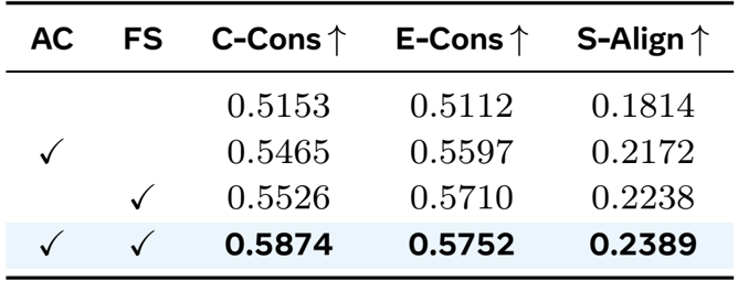 The authors evaluate the impact of their Adaptive Conditioner (AC) and Frame Selection (FS) modules through ablation, showing that combining both yields the highest character consistency, environment consistency, and semantic alignment. Results confirm that each component contributes independently, with their joint use delivering the strongest narrative coherence.