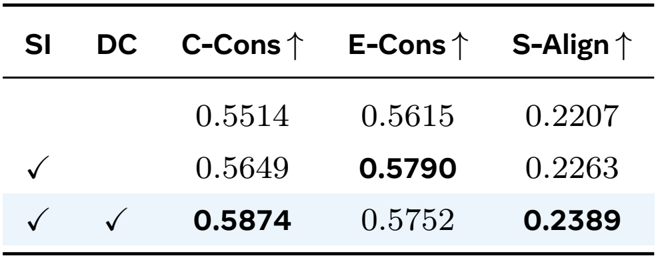 The authors evaluate the impact of their training strategies, showing that Shot Inflation alone improves environment consistency and semantic alignment, while combining it with Decoupled Conditioning yields the highest scores across all metrics, confirming the effectiveness of their two-stage curriculum for stable optimization and narrative coherence.