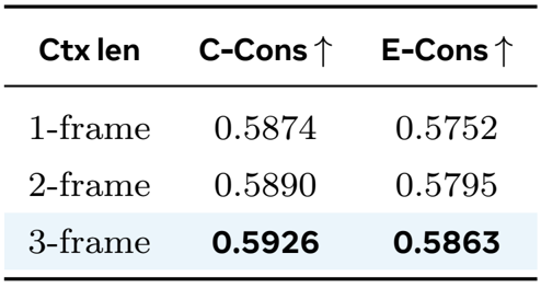 The authors evaluate the impact of context token length on cross-shot consistency, finding that increasing from one to three latent-frame equivalents improves both character and environment consistency. Results show a steady performance gain with more context tokens, confirming the efficiency of their adaptive memory in modeling temporal dynamics.