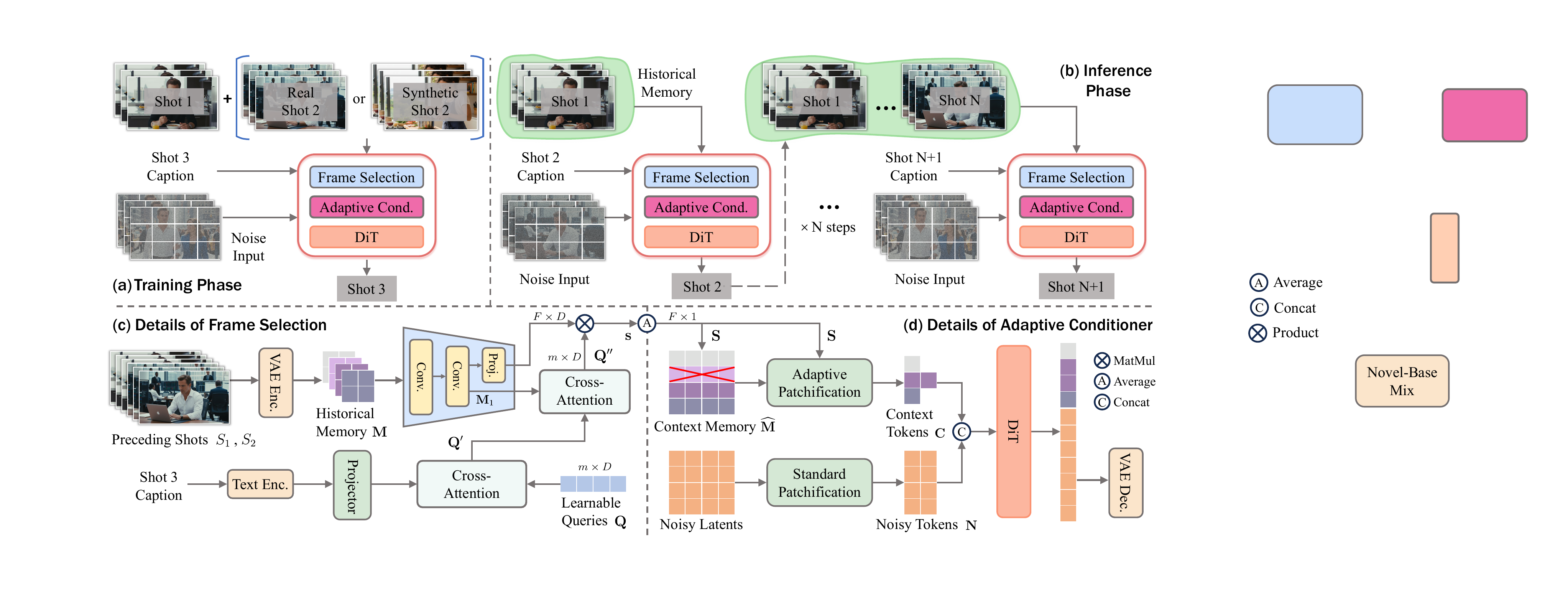 The resulting context tokens C are concatenated with the noisy latent tokens N of the current shot to form the input X for the DiT backbone. This concatenation enables joint attention between noisy and context tokens, facilitating rich cross-attention interactions that guide the denoising process. The model is trained with a joint objective that combines a standard shot generation loss Lshot with a supervision loss Lsel for the frame relevance scores. The latter is computed using pseudo-labels derived from DINOv2 and CLIP embeddings for real frames, and heuristic labels for synthetic frames, ensuring the Frame Selection module learns to prioritize semantically aligned context.