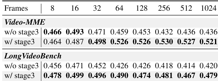Results show that InfiniteVL with Stage III long-sequence fine-tuning maintains or improves performance as input frame count increases beyond 32, while the version without Stage III degrades steadily. This confirms that Stage III enhances long-context generalization, enabling stable comprehension even at ultra-long sequences up to 1024 frames.