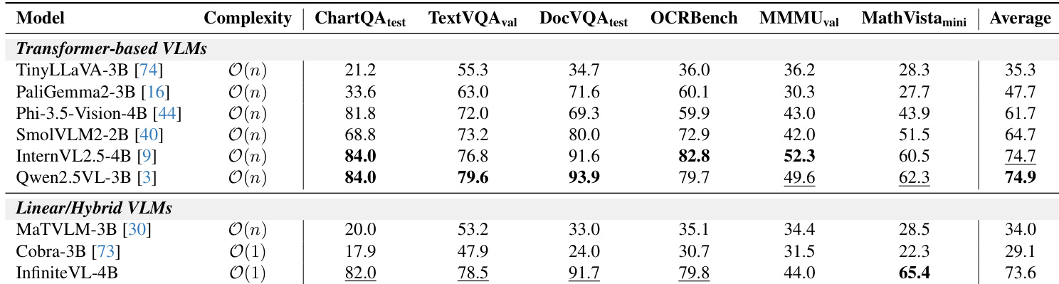 InfiniteVL-4B, a linear/hybrid VLM with O(1) complexity, achieves competitive performance on text-rich and reasoning benchmarks, matching or exceeding larger transformer-based models in several categories including ChartQA, TextVQA, and MathVista. While it falls slightly behind Qwen2.5VL-3B in overall average score, it outperforms it in MathVista and OCRBench, demonstrating strong capability in structured and mathematical reasoning tasks despite its constant-complexity design.