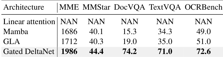 The authors evaluate different linear sequence modeling modules and find that Gated DeltaNet outperforms Mamba and GLA across key text-rich benchmarks, achieving the highest scores on DocVQA, TextVQA, and OCRBench. Linear attention alone fails to converge, while Gated DeltaNet’s state compression mechanism enables stable training and superior performance on fine-grained visual-language tasks.
