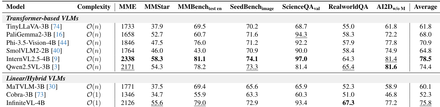InfiniteVL-4B, a linear/hybrid VLM with O(1) complexity, achieves an average score of 75.8 across multimodal benchmarks, outperforming other linear/hybrid models and approaching the performance of larger transformer-based models like InternVL2.5-4B and Qwen2.5VL-3B. It excels in RealworldQA and AI2D, demonstrating strong real-world comprehension and visual reasoning despite its constant-complexity design.