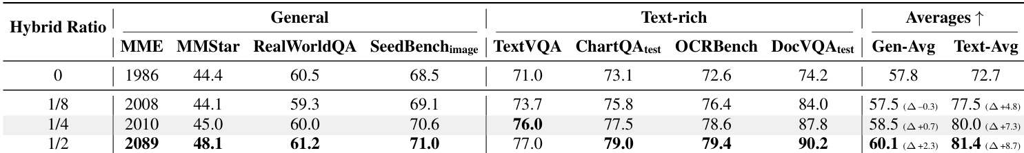 The authors evaluate how varying the proportion of sliding window attention layers affects performance, finding that even a small fraction (1/8) improves text-rich task scores significantly, with further gains at 1/4 and 1/2 ratios, though with diminishing returns. Results show that increasing the hybrid ratio boosts text-intensive benchmarks more than general multimodal ones, with the 1/2 configuration achieving the highest overall averages. The 1/4 ratio is selected as the default, balancing strong text-rich performance with efficient long-range context handling.