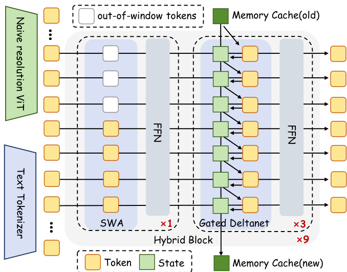 The authors leverage a hybrid architecture that combines local and global token mixing mechanisms to enable efficient, context-length-agnostic inference in multimodal settings. The framework begins by encoding visual inputs via a naïve-resolution ViT and textual inputs via a standard tokenizer, then concatenates and processes them through a stack of nine Hybrid Blocks. Each Hybrid Block is composed of one Sliding Window Attention (SWA) layer followed by three Gated DeltaNet layers, all interleaved with feed-forward networks (FFNs) and connected via residual pathways with layer normalization.
