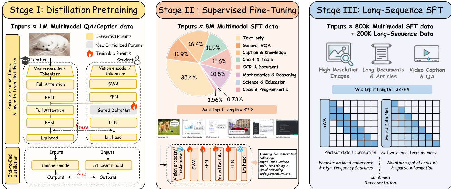 To train this architecture efficiently, the authors implement a three-stage strategy. Stage I performs layer-wise and end-to-end distillation from a full-attention teacher model (Qwen2.5-VL), replacing its attention layers with Gated DeltaNet while inheriting all other parameters. Layer-wise alignment is achieved via an MSE loss between corresponding layer outputs, followed by end-to-end distillation using KL divergence between token-level logits. Stage II applies supervised fine-tuning on a diverse multimodal instruction corpus, enhancing instruction-following and reasoning capabilities while increasing image resolution to 1344×1344. Stage III extends context length to 32,768 tokens and incorporates long-sequence data from video and document sources, trained via LoRA to focus model capacity on robust long-range modeling.