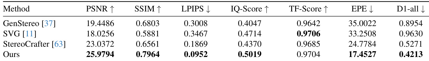 - Achieved state-of-the-art performance on quantitative metrics: on the test set, obtained 25.98 PSNR, 0.796 SSIM, 0.095 LPIPS, 0.502 IQ-Score, and 0.970 TF-Score, outperforming GenStereo, SVG, and StereoCrafter.