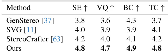 - Human evaluation with 20 participants showed significant improvements across all perceptual metrics: Stereo Effect (4.8), Visual Quality (4.7), Binocular Consistency (4.9), and Temporal Consistency (4.8), validating enhanced 3D immersion and visual fidelity.