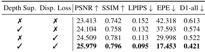 The authors evaluate the impact of depth and disparity supervision in their model, showing that combining both components yields the best performance across all metrics. Results indicate that disparity supervision alone improves geometric accuracy more than depth supervision, but the full model with both signals achieves the highest PSNR, SSIM, and lowest LPIPS, EPE, and D1-all scores. This demonstrates that the two supervision signals are complementary and essential for generating geometrically accurate and visually faithful stereo videos.