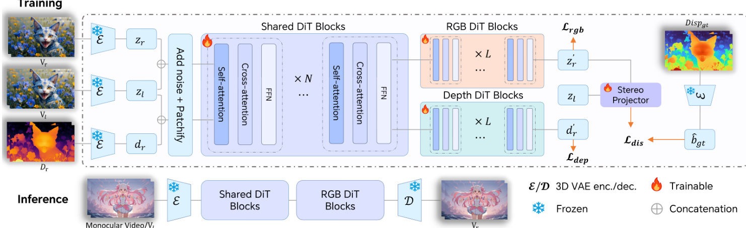 To adapt this monocular generator for stereo synthesis, the authors introduce a conditioning strategy that concatenates left-view and right-view latents along the frame dimension, enabling the model to naturally fuse cross-view information through its existing 3D attention mechanisms. This avoids architectural modifications and preserves computational efficiency. Refer to the framework diagram for a visual overview of the training and inference pipelines.