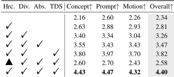 The authors evaluate BiCo’s component contributions through ablation studies, showing that combining hierarchical binders, prompt diversification, absorbent tokens, and the TDS strategy yields the highest human evaluation scores across concept preservation, prompt fidelity, motion quality, and overall performance. Removing the two-stage inverted training strategy significantly degrades all metrics, confirming its critical role in stabilizing optimization. Results demonstrate that each component incrementally improves composition quality, with the full configuration achieving the best scores.