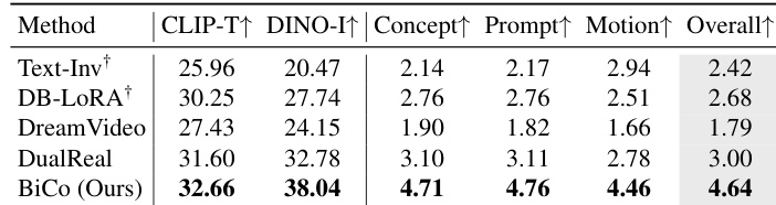 - On a test set of 40 cases from DAVIS and the Internet, BiCo achieves state-of-the-art performance: 32.66 CLIP-T and 38.04 DINO-I, outperforming DualReal [55] by +54.67% in Overall Quality (4.64 vs 3.00) in human evaluations.