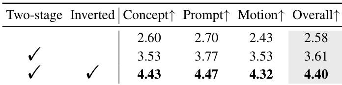 The authors evaluate the impact of their two-stage inverted training strategy on BiCo’s performance, showing that both the two-stage and inverted components are essential. Results indicate that using both techniques together yields the highest scores across all human evaluation metrics, including Concept, Prompt, Motion, and Overall Quality. Without this strategy, performance drops significantly, confirming its role in stabilizing training and improving concept binding.