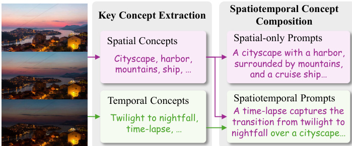 To enhance the fidelity of concept-token binding, especially under one-shot constraints, the authors introduce the Diversify-and-Absorb Mechanism (DAM). This mechanism leverages a Vision-Language Model (VLM) to extract key spatial and temporal concepts from the visual input and generate multiple diverse prompts that preserve the core semantic elements. The VLM first identifies critical concepts—such as “cityscape,” “twilight to nightfall,” or “harbor”—and then composes them into varied prompt formulations, including spatial-only and spatiotemporal variants. To mitigate interference from irrelevant visual details, a learnable absorbent token is appended to the prompt during training and later discarded during inference, effectively filtering out noise and improving binding accuracy.