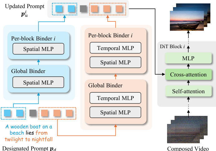 f(p)=p+γ⋅MLP(p).For video inputs, the binder is extended into a dual-branch architecture with separate spatial and temporal MLPs, allowing the model to disentangle and independently optimize spatial and temporal concept representations. During inference, the designated prompt pd is decomposed into concept-specific segments, each routed through its corresponding binder. The outputs are then composed into a unified updated prompt pui for each DiT block, enabling flexible concept manipulation.