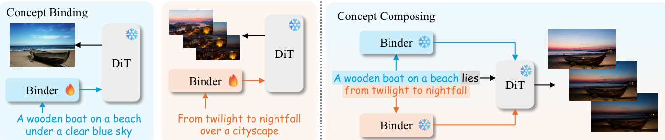 In the concept binding phase, each visual input—whether an image or video—is paired with its textual description. A binder module, attached to the DiT’s cross-attention conditioning layers, transforms the prompt tokens to encode the visual appearance or motion observed in the input. This binding is performed in a one-shot manner, requiring only a single forward-backward pass per source. The resulting updated prompt tokens are then used as key-value inputs in the DiT’s cross-attention layers during denoising. As shown in the framework diagram, this process enables the model to internalize the visual semantics of each concept independently before composition.