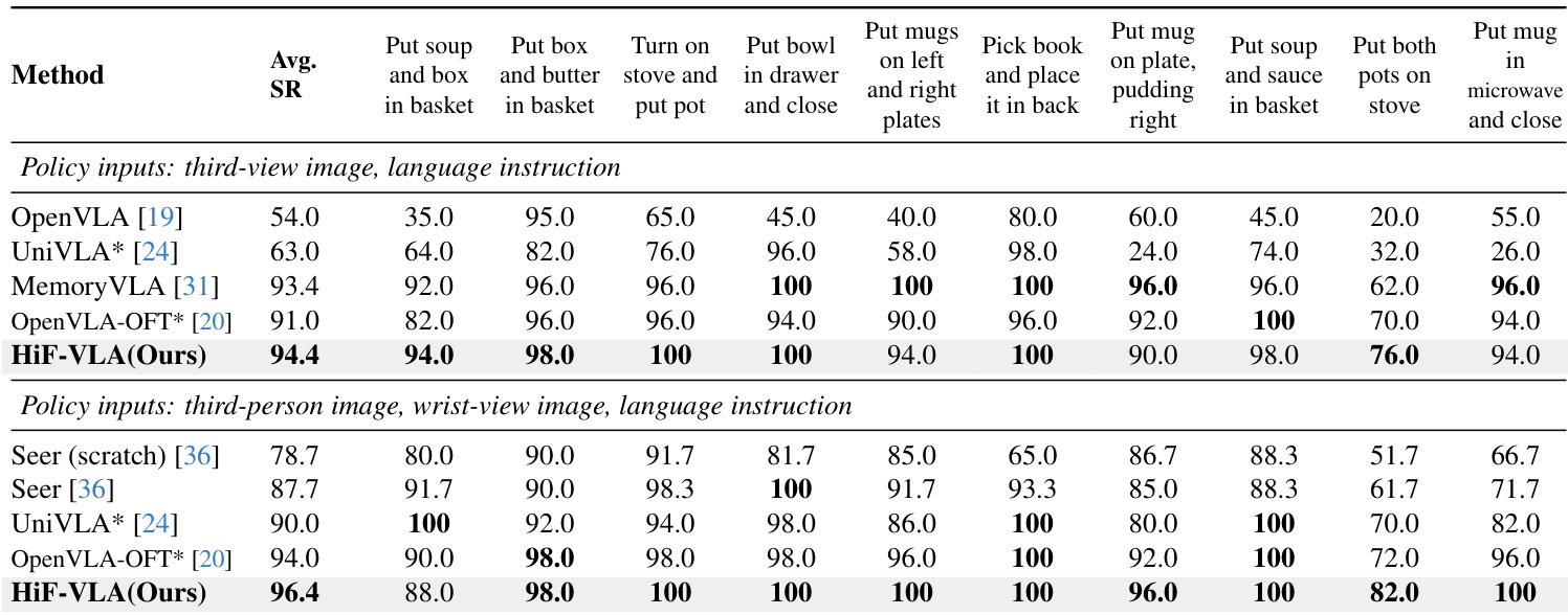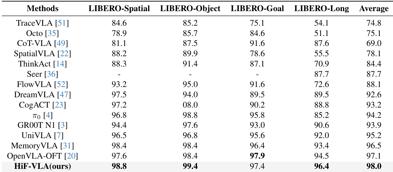 - On the full LIBERO benchmark (four suites), HiF-VLA achieves 98.0% average success rate, outperforming existing approaches such as OpenVLA-OFT (97.1%) and MemoryVLA (96.5%).