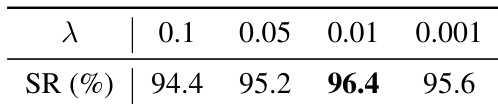 The authors evaluate the impact of the foresight motion loss weight λ on task success rate, finding that λ = 0.01 yields the highest performance at 96.4%. Results show that moderate weighting of motion prediction enhances planning without destabilizing the model, while higher or lower values reduce effectiveness.