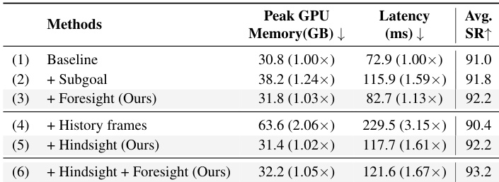 - Ablation studies show that hindsight length of 8 and expert-conditioned embedding yield optimal performance, with 96.4% success on LIBERO-Long.