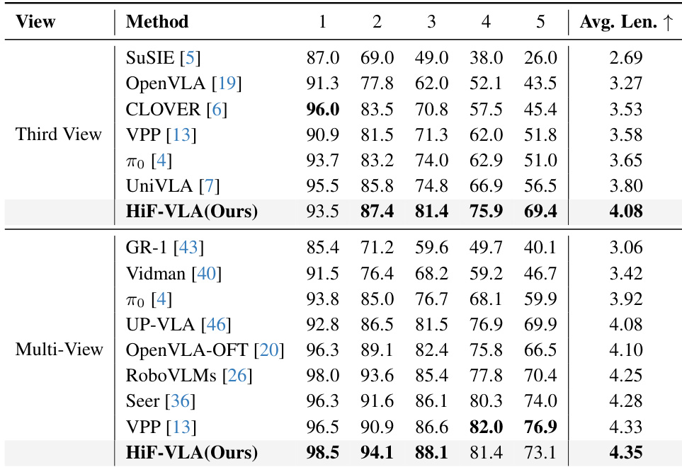 - Evaluated on LIBERO-Long and CALVIN ABC-D benchmarks, HiF-VLA achieves 96.4% success rate (multi-view) and 4.35 average task length on CALVIN, surpassing prior state-of-the-art methods including Seer, VPP, and OpenVLA-OFT.