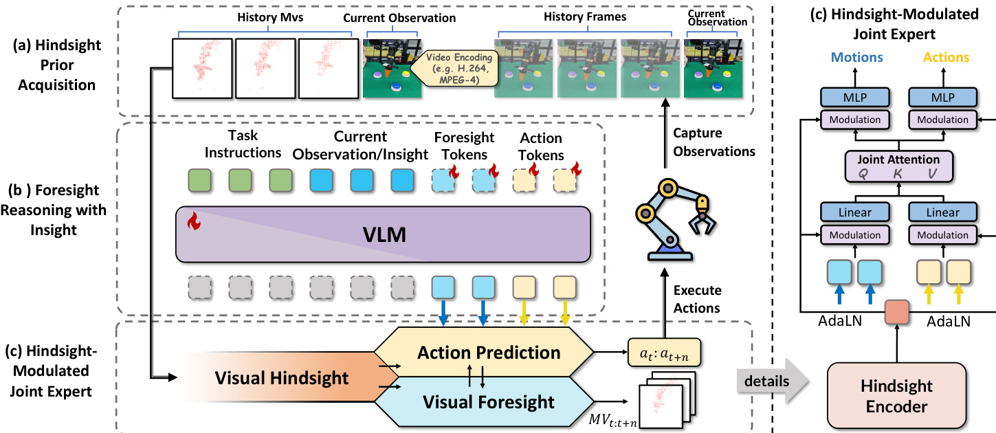 The framework operates in three primary stages: hindsight prior acquisition, foresight reasoning with insight, and hindsight-modulated joint expert fusion. In the first stage, historical visual dynamics are encoded into compact motion vectors (MVs) using MPEG-4 video encoding standards. These MVs, derived from macroblock displacements between consecutive frames, form a structured, low-redundancy representation of past manipulator motion. A lightweight ViT-based encoder, augmented with shallow 3D convolutions, processes this MV stream into compact hindsight tokens Mh∈RKh×d, which serve as a temporal prior without disrupting the VLM’s modality alignment.