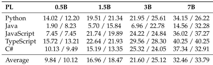 - Confirmed data scaling yields greater gains than model scaling across all PLs, with distinct convergence rates and intrinsic difficulty per language.