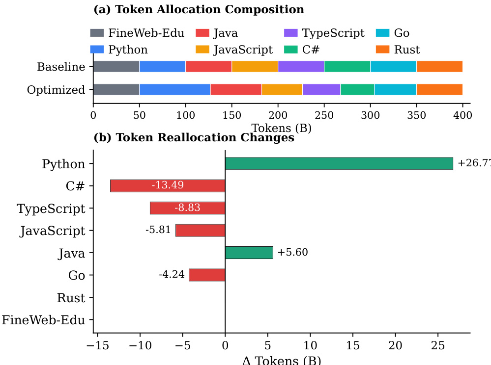 The authors use a proportion-dependent multilingual scaling law to optimize token allocation across programming languages, redistributing tokens based on language-specific scaling exponents, synergy gains, and irreducible loss. Results show that the optimized strategy increases tokens for high-utility languages like Python and high-synergy pairs such as JavaScript-TypeScript while reducing tokens for fast-saturating languages like Go, achieving higher average performance across all languages without significant degradation in any single language.
