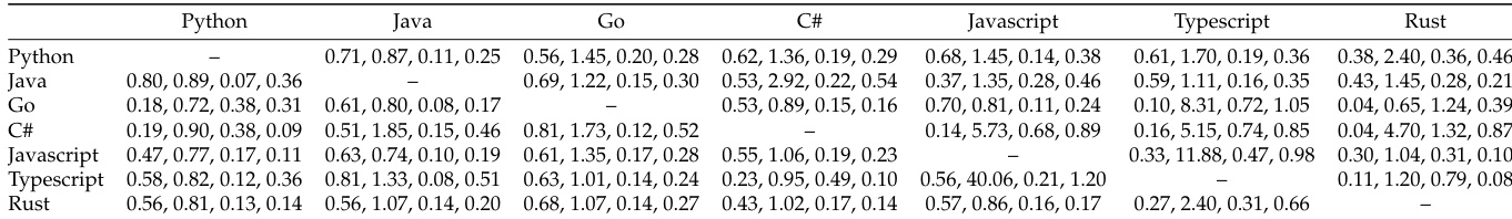 - No training data exists for the 30 non-Python ↔ non-Python directions — these are evaluated zero-shot.