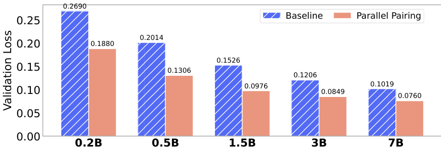 The authors compare two data organization strategies for multilingual code pre-training, showing that parallel pairing significantly reduces validation loss across all model sizes compared to the baseline. Results demonstrate that parallel pairing achieves lower validation loss than random shuffling, with the gap increasing as model size grows, indicating more efficient utilization of model capacity for cross-lingual alignment.