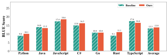- Evaluated using translation loss: −E[log P(y|x)] for target code y given source x.
