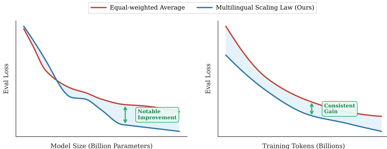 L(N,D;p)=A⋅N−αN(p)+B⋅Dx−αD(p)+L∞(p)Here, N denotes the number of model parameters, D is the total training data size, and L represents the model's loss. The exponents αN(p) and αD(p), as well as the asymptotic loss L∞(p), are proportion-weighted averages of language-specific parameters. Specifically, αN(p)=∑kpkαNk, αD(p)=∑kpkαDk, and L∞(p)=∑kpkL∞k, where αNk, αDk, and L∞k are the scaling parameters for language k. This formulation allows the model to adapt its scaling behavior based on the relative contribution of each language in the training mix.