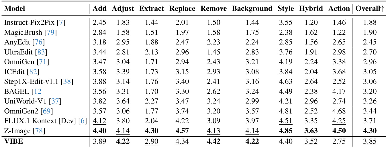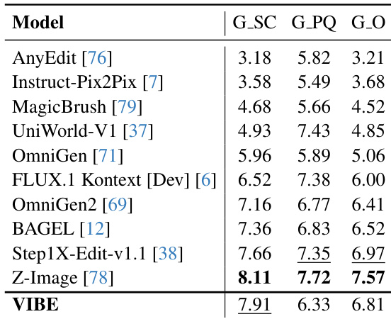 - On GEdit-Bench-EN, VIBE achieved an overall score of 6.81, with a second-highest semantic consistency score of 7.91, indicating reliable instruction adherence, though perceptual quality (6.33) was lower than specialized models, likely due to minor artifacts rather than semantic misalignment.