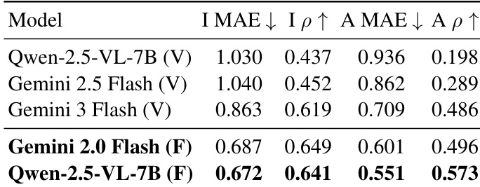 The authors use a quantitative comparison to evaluate model performance on the ImgEdit benchmark, focusing on metrics such as I MAE, I ρ, A MAE, and A ρ. Results show that the Gemini 2.0 Flash (F) model achieves the best performance across all metrics, outperforming both Gemini 2.5 Flash (V) and Qwen-2.5-VL-7B (V) and (F), with the lowest I MAE and A MAE values and the highest I ρ and A ρ scores.