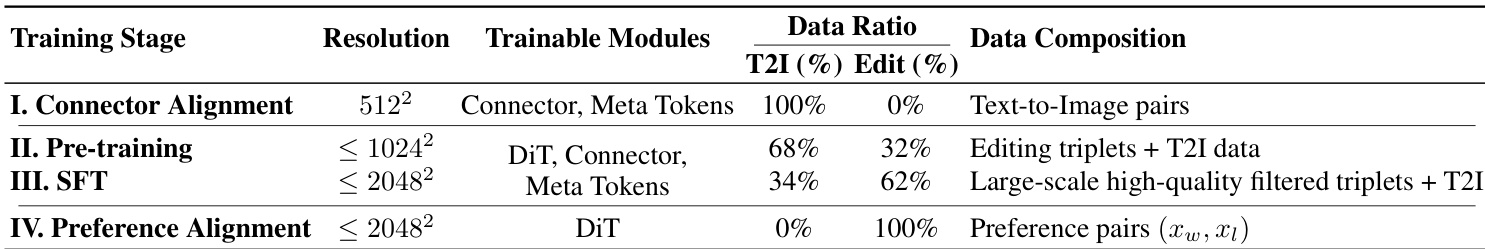 The authors use a four-stage training process that progressively increases resolution and focuses on different trainable modules and data compositions. The final stage, Preference Alignment, uses only preference pairs at high resolution with DiT as the trainable module, indicating a shift toward fine-tuning for instruction-following and editing quality.
