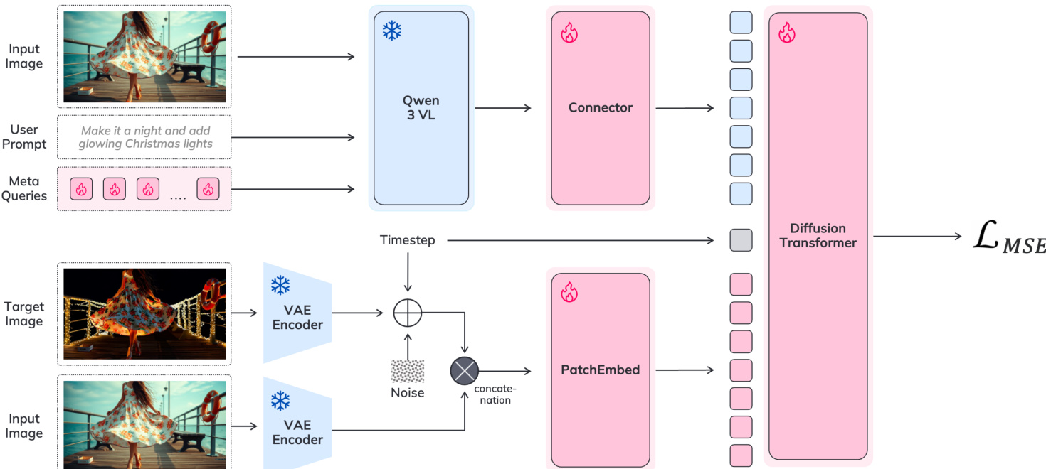 The training process is structured in four stages to ensure stability and high-quality output. The first stage is a connector alignment phase, where the VLM and diffusion model are frozen, and only the connector is trained on a text-to-image generation task to establish a stable interface between the two components. This prevents catastrophic forgetting of the diffusion model's generative prior during subsequent training. The second stage is a multi-stage training phase that begins at 5122 resolution and progresses to 20482. This phase employs a mixed-data strategy, training the model on both instruction-based editing triplets and high-quality text-to-image pairs within the same batch. For text-to-image samples, an empty conditioning image is used, which is masked out in the attention layers. This joint training regularizes learning and preserves the model's foundational generative capabilities. The third stage involves large-scale pre-training and supervised fine-tuning (SFT) at resolutions up to 20482, utilizing a high-quality, filtered dataset. During this phase, the model is trained on both editing and text-to-image tasks, with the VLM backbone remaining frozen. The final stage applies Diffusion-DPO (DPO) to refine the model's instruction adherence and visual quality. The training pipeline also employs a mixed-resolution strategy, training simultaneously on data from 3842 to 20482 with diverse aspect ratios, which accelerates convergence and preserves high-resolution generative priors. This approach diverges from traditional progressive resizing, as the pre-trained diffusion backbone does not require a low-resolution warm-up.