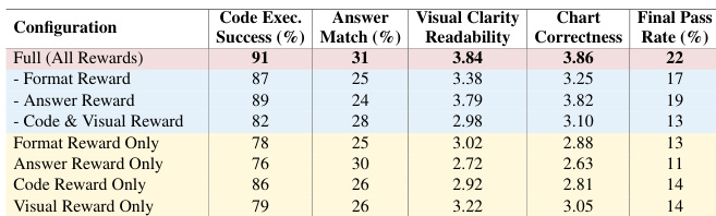 The authors use an ablation study to evaluate the contribution of individual reward components in the RL-Text2Vis framework. Results show that the full multimodal reward, combining code execution, answer matching, and visual quality signals, achieves the highest performance across all metrics, with a final pass rate of 22%, significantly outperforming any single reward component alone.