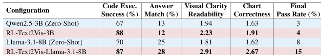 - Evaluated on the Text2Vis benchmark and out-of-domain datasets like VIS-Eval and NVBench, RL-Text2Vis achieves a 22% relative improvement in chart quality over GPT-4o and increases code execution success from 78% to 97% compared to its zero-shot baseline.