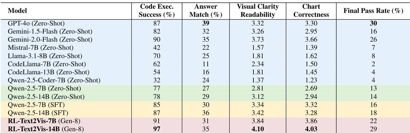 - RL-Text2Vis significantly outperforms zero-shot and SFT baselines on Text2Vis: 14B model achieves 4.10 readability and 4.03 correctness (vs. 3.12 and 2.94 for zero-shot), 97% code executability (vs. 78%), and 35% answer match (vs. 29%); surpasses GPT-4o in chart readability (4.10 vs. 3.32) and correctness (4.03 vs. 3.30).