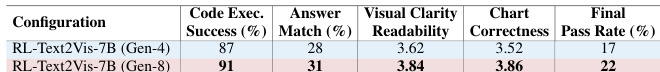 - Demonstrates strong out-of-domain generalization: on VisEval, 7B model improves readability from 1.50 to 2.50 and correctness from 0.69 to 1.37; on NVBench, code execution rises from 75% to 93%, readability from 2.64 to 3.47, and correctness from 2.34 to 3.28.