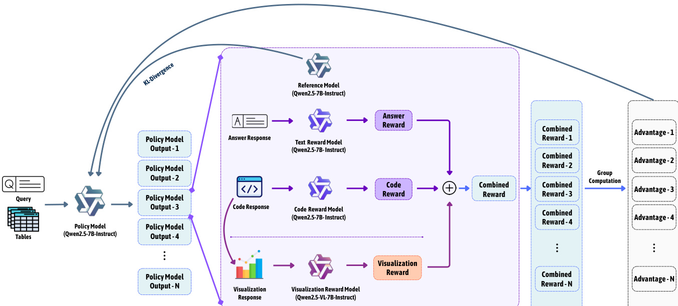 As shown in the figure below, the training process begins with the policy model (Qwen2.5-7B-Instruct) generating multiple candidate outputs for a given query and table. Each output is processed through separate reward models: a text reward model evaluates the answer for semantic alignment with the ground truth, a code reward model assesses code executability and intent match, and a visualization reward model evaluates the rendered chart for readability and correctness. These individual rewards are combined into a composite reward for each output. The rewards are then standardized within the group of generated outputs to compute normalized advantages, which are used in the GRPO objective function. The policy update is performed using a clipped surrogate objective that incorporates a KL divergence penalty to the reference policy (Qwen2.5-7B-Instruct), ensuring stable and bounded updates.