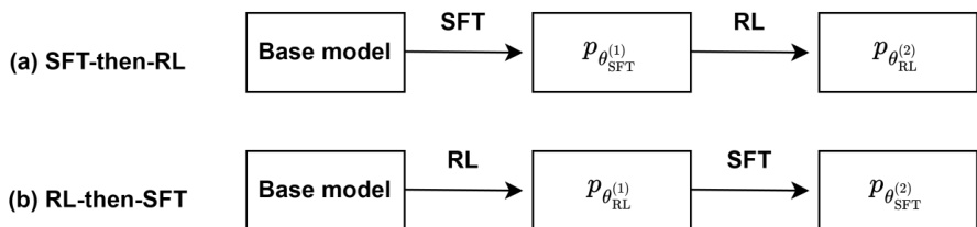 The authors investigate the interaction between supervised fine-tuning (SFT) and reinforcement learning (RL) in post-training pipelines for language models, focusing on the non-decoupling of these stages. The overall framework begins with a pretrained base model, which undergoes either SFT or RL as a post-training step, followed by the other, before reaching test-time computation. The two primary sequential strategies are SFT-then-RL and RL-then-SFT, which are analyzed to determine if the stages can be treated as independent optimizations.