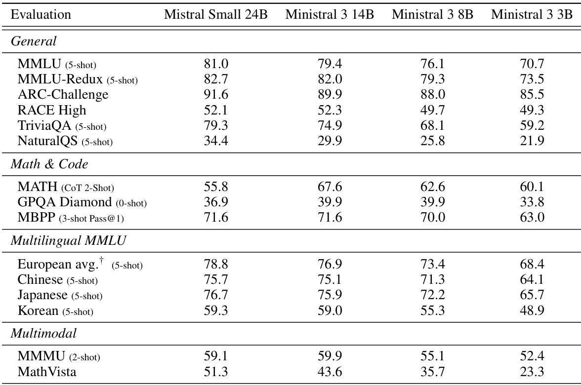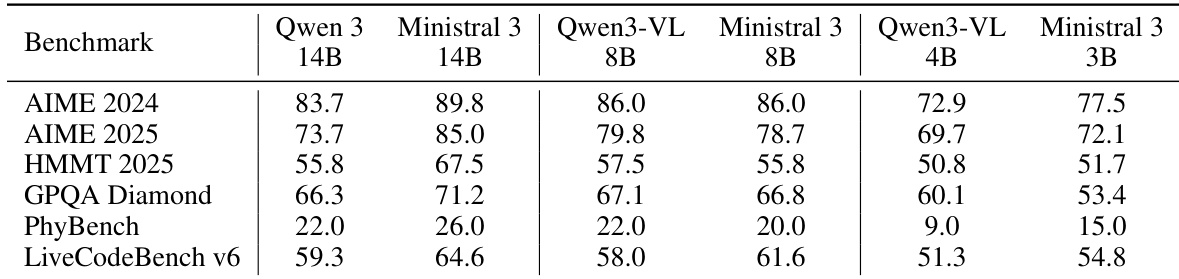- Ministral 3 Instruct models achieve competitive results against Qwen 3 and Gemma 3 families across general, math, code, and multimodal benchmarks, with Ministral 3 Reasoning models matching or exceeding Qwen 3 counterparts on STEM tasks.